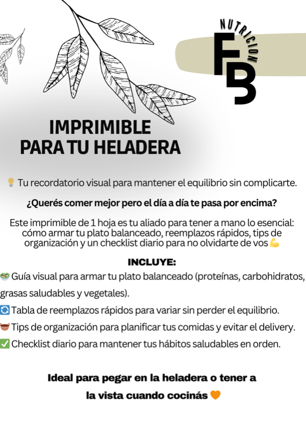 Este imprimible de una hoja es tu aliado para tener a mano lo esencial: cómo armar tu plato balanceado, reemplazos rápidos, tips de organización y un checklist diario para no olvidarte de vos 💪